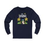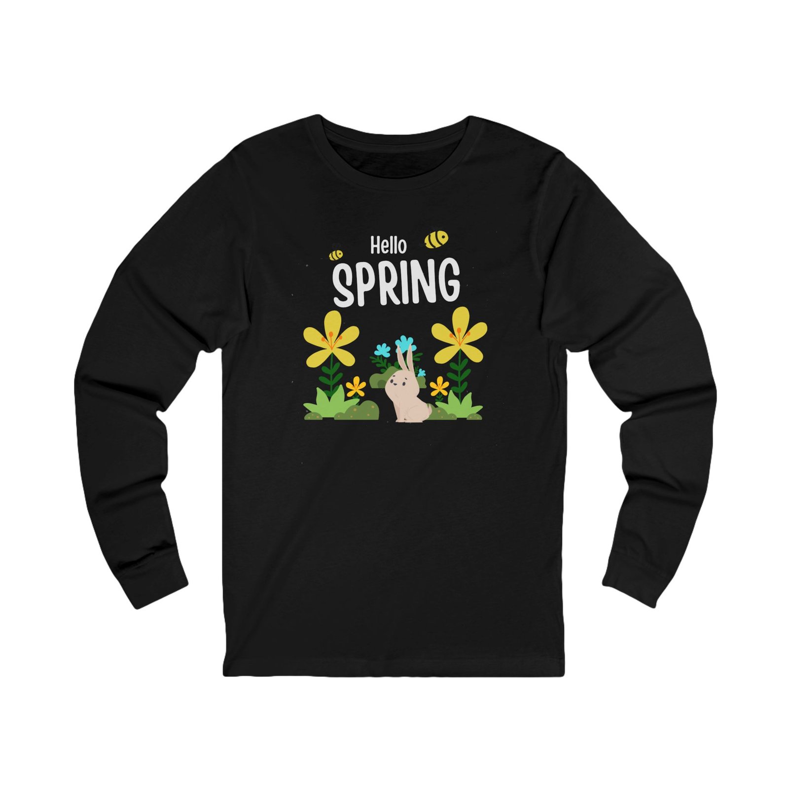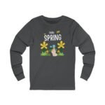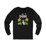 Celebrate the gentle return of warmer days with this lightweight long sleeve tee. Soft, breathable cotton and a retail fit make it easy to layer or wear alone on cool spring mornings. A whimsical ‘Hello Spring’ graphic—complete with friendly blooms, buzzing bees, and a curious bunny—brings quiet joy to everyday moments. Wear it to stroll neighborhood paths, tend small garden plots, or share a cozy coffee on a porch as new green pushes up through the soil. The simple silhouette and crisp print age well, letting the design shine while keeping you comfortable from dawn chores to evening gatherings.